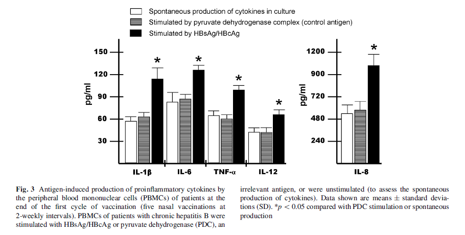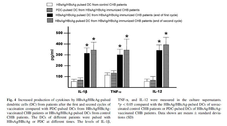 接種疫苗后,慢乙肝患者的 PBMC 和 HBsAg / HBcAg 脈沖致敏樹突細胞(DC)產生的各種細胞因子[白介素1b(IL-1b),IL-6,IL-8,IL-12和腫瘤壞死因子a(TNF -a)]比未接種的對照者更高(p < 0.05)。如下