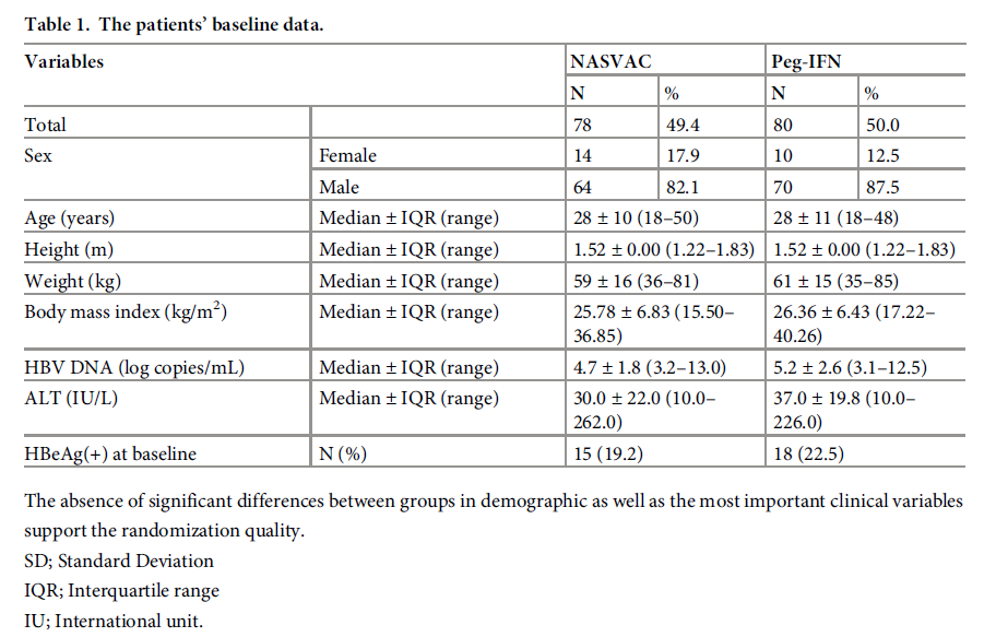 該項 III 期臨床為單中心(在孟加拉國的 Farabi 醫院完成),治療對照,開放標簽,隨機臨床試驗。研究納入了160名(跟先前發表的報道中提及的數量有出入)未經治療的慢乙肝患者作為研究對象,分為兩組,各組80名,分別接受 NASVAC(包含 100 μg HBsAg 和100 μg HBcAg) 或 Peg-IFNα-2b 用藥治療。受試對象基線特征如下