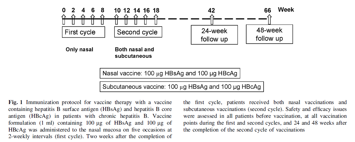 此次的研究用藥為含 100 μg HBsAg 和 100 μg HBcAg 的疫苗,每兩周用藥一次,總共10次,前5次為鼻腔給藥,后5次通過鼻腔和皮下同時給藥。如下