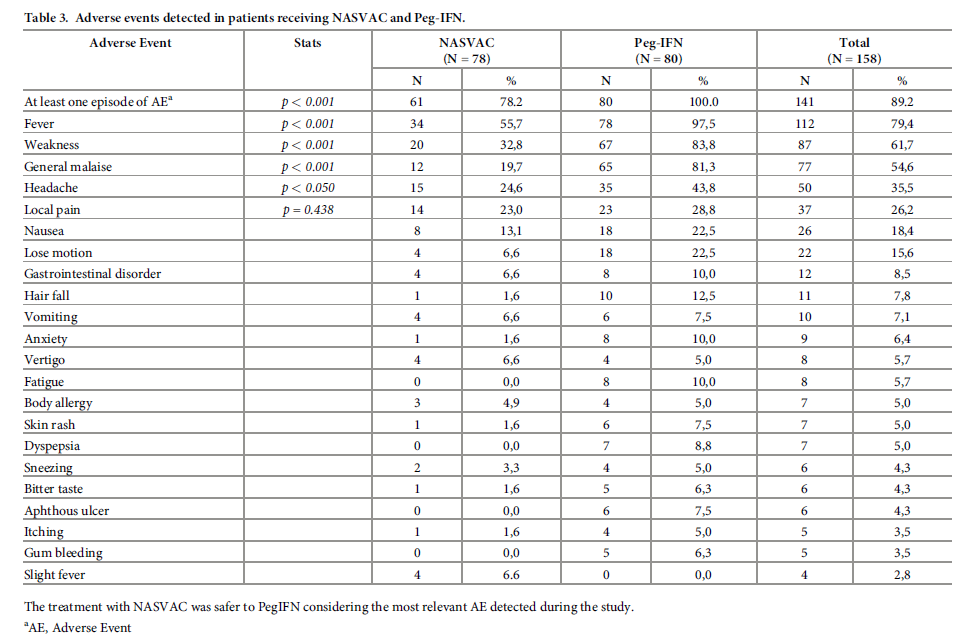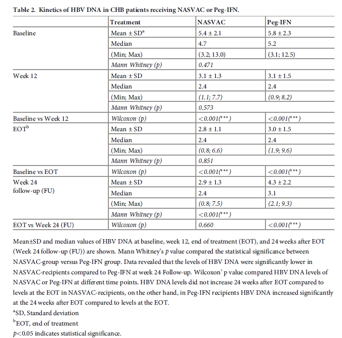 治療結束時(EOT),NASVAC 組和 Peg-IFN 組的抗病毒作用相當。與接受 Peg-IFN 者相比,NASVAC組中乙型肝炎e抗原(HBeAg)的清除也更為頻繁。 與 Peg-IFN 組相比,NASVAC 組的肝硬化進展較低。