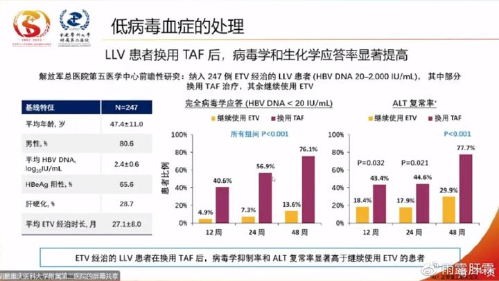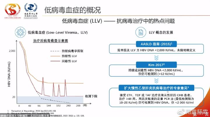 一、國內(nèi)外研究顯示,低病毒血癥發(fā)生率為20% - 40%2022年《擴大慢性乙型肝炎抗病毒治療的專家意見》指出,將接受ETV、TDF或TAF治療且依從性良好的慢乙肝患者,治療≥ 48周,用高靈敏度的定量PCR法(最低檢測限為10 - 20 IU/mL)仍可檢測到HBV DNA,但< 2000 IU/mL的這部分患者定義為低病毒血癥。