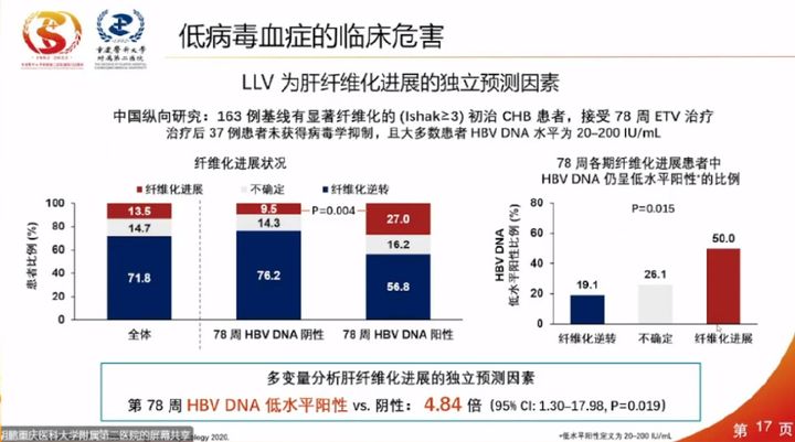 二、低病毒血癥增加慢乙肝患者的肝纖維化、終末期肝病及肝癌發(fā)生風險國內(nèi)一項縱向研究納入163例基線時存在顯著纖維化(Ishak ≥ 3)的初治慢乙肝患者,接受ETV治療78周后有37例患者未獲得病毒學抑制,且大多數(shù)患者HBV DNA水平為20 - 200 IU/mL。多因素分析顯示,與HBV DNA陰性患者相比,第78周HBV DNA低水平陽性患者的肝纖維化進展風險升高了4.84倍(95% CI: 1.30 - 17.98, P = 0.019)。