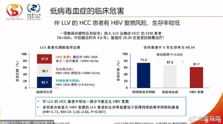 韓國一項回顧性研究納入565例伴低病毒血癥且確診HCC的慢乙肝患者,中位隨訪4.5年,伴低病毒血癥的HCC患者中相當一部分(61.7%)可能發(fā)生HBV復燃(HBV DNA ≥ 2000 IU/mL),多因素分析提示發(fā)生HBV復燃的低病毒血癥患者的生存率顯著低于獲得持續(xù)病毒學抑制的患者(HR = 1.71, 95% CI: 1.15 - 2.55, P = 0.007)。