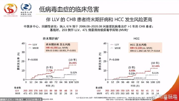 中國的一項多中心、回顧性研究納入674例于2006年8月至2020年8月間接受抗病毒治療> 1年的慢乙肝患者;與獲得持續(xù)病毒學抑制的患者相比,伴低病毒血癥的慢乙肝患者5年及10年的終末期肝病(5年:7.73% vs. 0.77%;10年:15.85% vs. 5.52%,P = 0.000)與HCC(5年:4.49% vs. 0.33%;10年:12.44% vs. 5.11%,P = 0.009)發(fā)生風險均顯著更高。